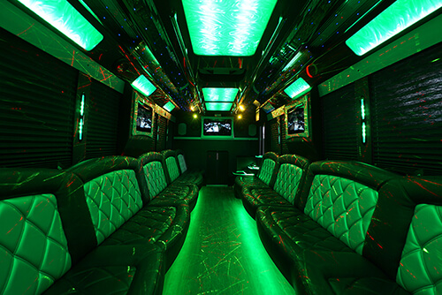 An ever popular size, the 30 passenger party bus is a great option, it's both spacious and luxurious. As pictured above, this large bus is a great choice for events where a view of the outside world is particularly appreciated with it's full sided tinted windows. It also caters to the parties with multiple TVs and great audio.